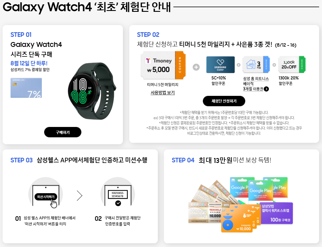 워치 4는 'Galaxy Watch4 ‘최초’ 체험단' 이라는 이벤트로 오늘 (2021.08.12) 하루 이벤트도 하네요.